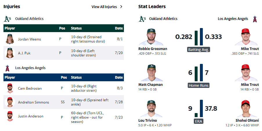 Mike Fiers가 Oakland의 마운드에 설 것이다. 7월 26일 에인절스와의 원정경기에서 4이닝 7피안타 4실점하는 등 3선발 평균자책점 5.63으로 1-0이다.피어스는 에인절스와의 15경기(14선발)에서 6-4로 평균자책점 5.18을 기록하고 있으며, 선수 생활 동안 피어스를 잘 친 LA 타자들도 있다. 마이크 트라웃이 3할8푼7리(31타수 12안타)로 홈런 5개, 복식 4개를 맞고 있다. 데이비드 플레처는 11타수 7안타, 오타니 쇼헤이는 11타수 6안타.오른손 투수 딜런 번디(2-1, 방어율 2.08)가 이번 시즌 에인절스 선발로 출전해 최고의 활약을 펼친다.