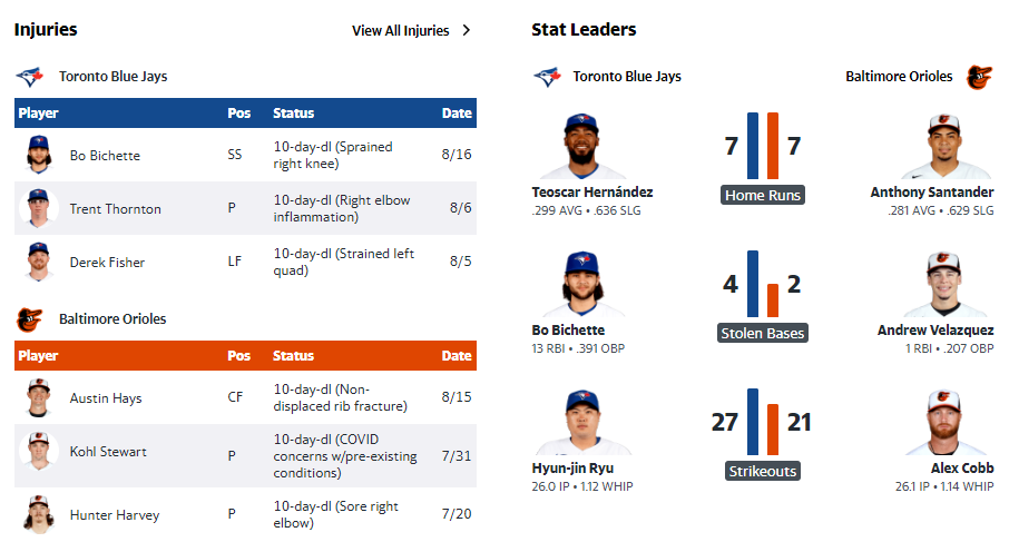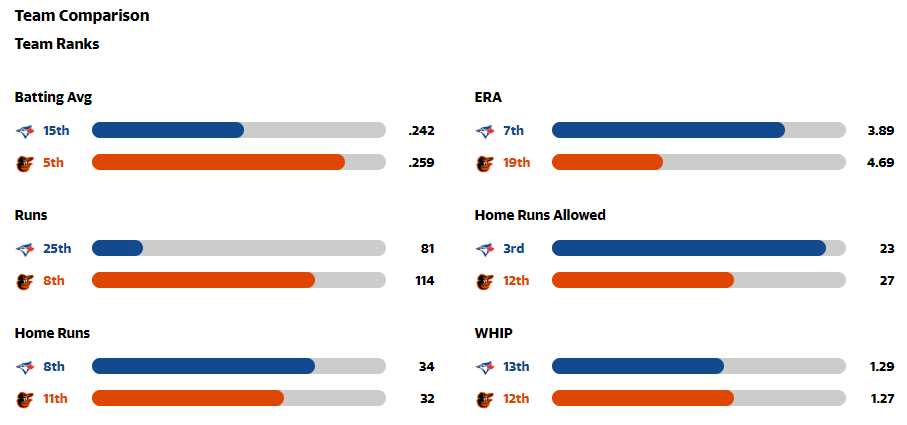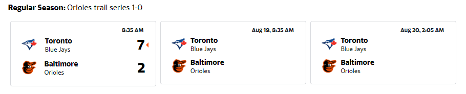 우익수는 50타수 17안타(.340)로 연타석 중 홈런 5개, 타점 15개를 기록하고 있다.오리올스 팀은 월요일 두 번의 투구 동작을 취했다. 그들은 10일간의 부상자 명단에서 딜런 테이트를 재설치하는 동안 에반 필립스를 보위의 대체 훈련장으로 보냈다. 테이트가 오른쪽 팔꿈치뼈가 삐어져서 자리를 비운 상태였다.테이트는 콥을 안심시키며 마지막 2 1/3이닝을 던지며 빅지오의 투런 홈런을 내줬다.블루제이스는 최근 메이저리그에서 경기를 치르지 못한 우완 샘 가비글리오를 로체스터에 있는 대체 훈련장으로 선택했다.