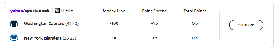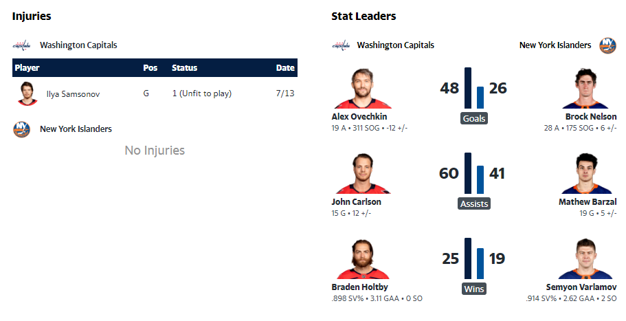 워싱턴은 이 시리즈에서 5대5로 75대53으로 앞서고 있으며 NHL의 간판 골잡이 알렉스 오벡킨의 2차전에서 모두 5대5로 두 골을 넣었다. 오페치킨의 첫 골은 불과 56초 만에 나왔고 두 번째 골은 브렌든 딜런의 슬랩슛을 리다이렉트로 연결했다.캐피털스의 우완투수 톰 윌슨은 "플레이오프에서 성공하기 위해서는 상대팀에게 압도적인 느낌을 주고 파도타기를 할 필요가 있다"고 말했다. 그는 "아직 어떤 이유로든 그런 일은 하지 않았고 플레이오프에서 모든 선수가 필요하고 팀 전체가 상대팀에게 힘든 곳에서 그런 정체성을 만들어야 한다는 것이 중요하다"고 말했다. 그리고 그것으로 여전히 더 잘 할 수 있을 것 같다."